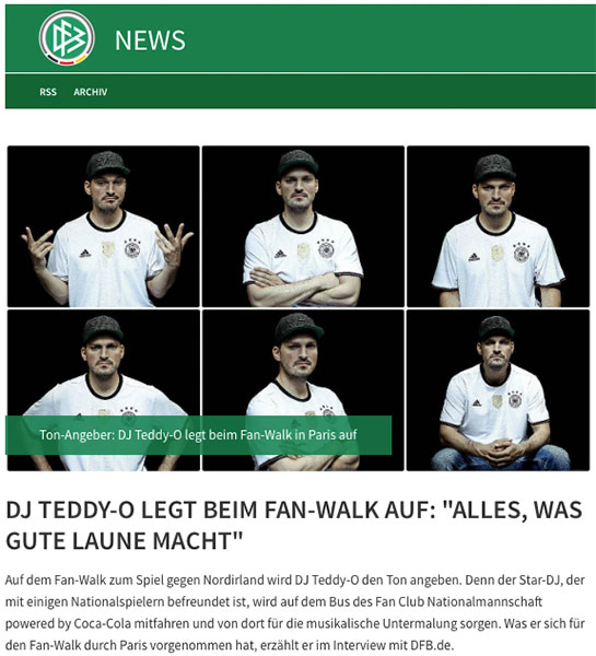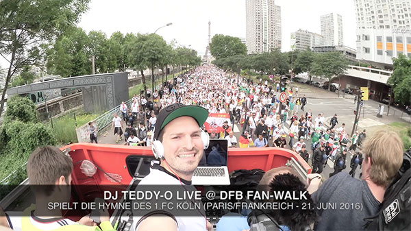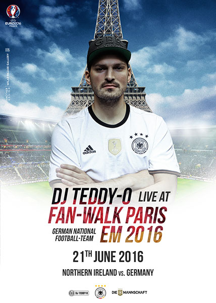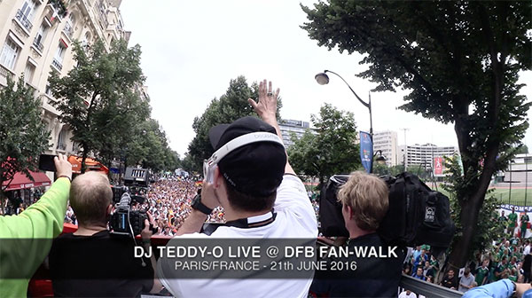 Die Deutsche National Elf wollte nicht auf die musikalischen Dienste ihres Kumpels verzichten und deshalb wurde Teddy-O für die offiziellen Fan-Walks angangiert. Unter anderem in Paris, Lille, Marseille und Bordeaux beim dem bis 10.000 Deutschland-Fans mitliefen.